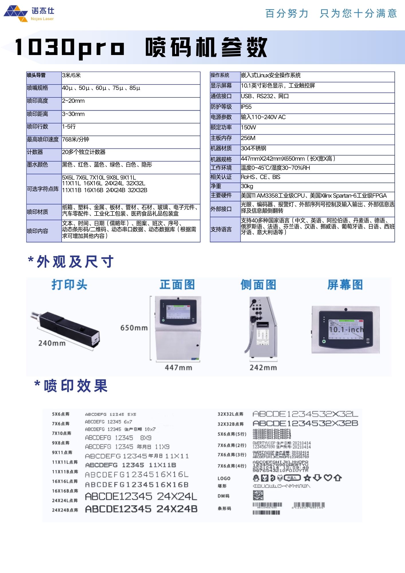 文字高度 :1-13mm 印字速度:200米/分钟 文字种类:英文字母(大/小写)、数字、记号、中文、图案 喷印行数与点阵构成:1-4行:5*5点阵,1-3:7*8/7*5点阵,1-2行:12*10、10*8、9*9、9*7点阵
